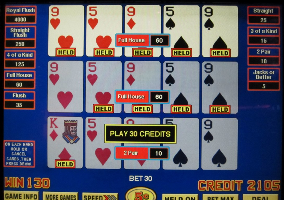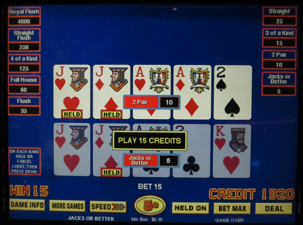 В приведенном выше примере после раздачи у меня осталась только одна карта — валет бубен. При первом розыгрыше она превратилась в пару валетов, за которую я получил 5 кредитов. Затем я оставил эту пару, и при втором розыгрыше она превратилась в две пары, за которые я получил 10 кредитов. Мой общий «выигрыш» составил 5+10=15 кредитов. Поскольку это была моя первоначальная ставка, я фактически вышел в ноль.