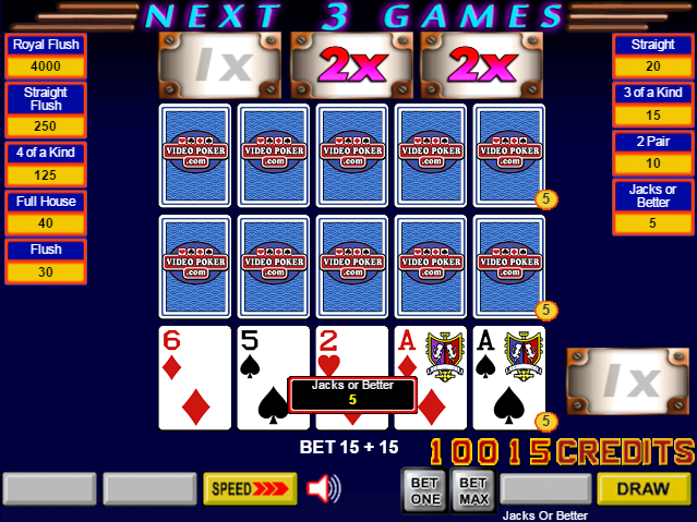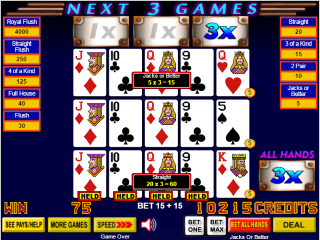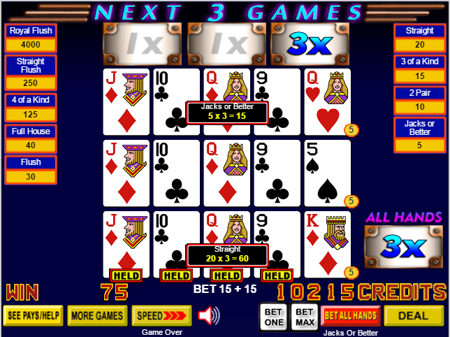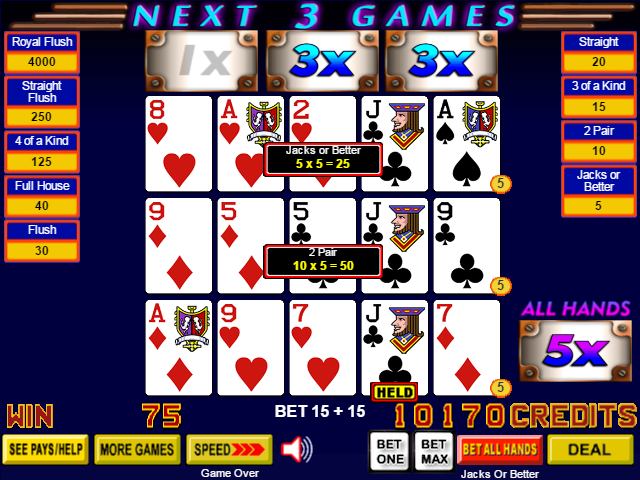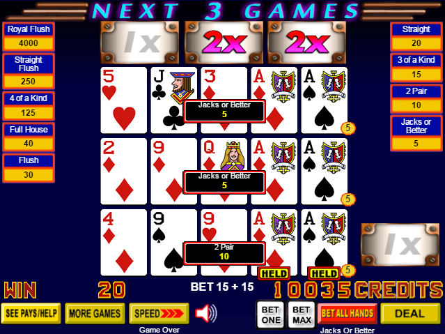 - Если игрок получит хотя бы минимальную покерную комбинацию при раздаче, которая зависит от игры, то он будет выигрывать множители вплоть до следующих трех игр.