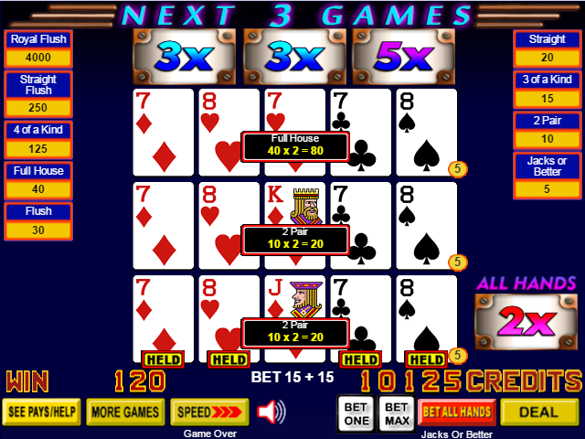 Моя пара превратилась в фулл-хаус за одну раздачу. Исходя из множителя 2x, ставки в пять монет на линию и базового выигрыша в 2 за пару и 8 за фулл-хаус, общий выигрыш составляет 2×5× (2×2 + 1×8) = 120.