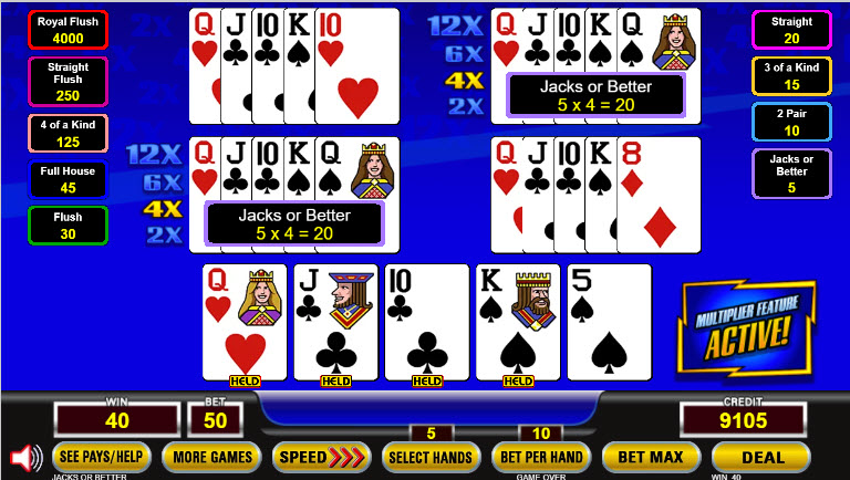 В следующем примере я играл в 5-play 9-6 Jacks or Better. Вот что я выиграл в каждой раздаче: