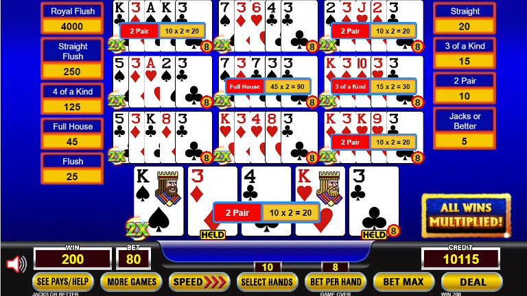 На изображении выше сразу после раздачи был начислен множитель 2x. После раздачи у меня было четыре пары, одна тройка и один фулл-хаус. До применения множителя выигрыш по этим комбинациям составлял 10, 15 и 45 соответственно. Таким образом, мой общий выигрыш за раздачу составляет 2*(4*10 + 15 + 45) = 200.
