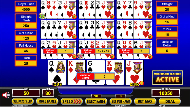 На изображении выше я получил два множителя после розыгрыша. Один из них — 3x в верхнем левом углу, что было проигрышной комбинацией, поэтому он не помог. Другой — 7x в третьей строке сверху, в среднем столбце. Эта комбинация — валеты или лучше, за которые обычно выплачивается 5. У меня также было еще три комбинации с валетами или лучше, которые не принесли множителя. Таким образом, мой общий выигрыш составил 7*5 + 3*5 = 35 + 15 = 50 кредитов.