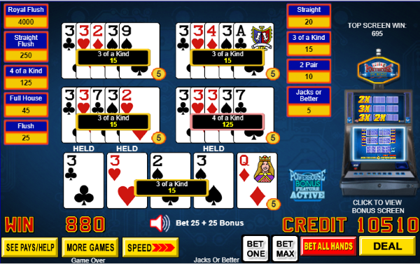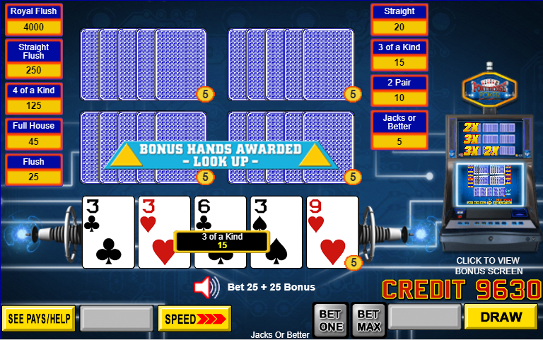 На изображении выше я играл в Jacks or Better с пятью картами и получил три одинаковые карты при раздаче. Игра предлагает мне посмотреть на свои бонусные руки.