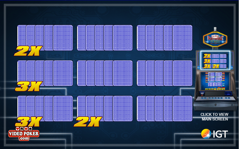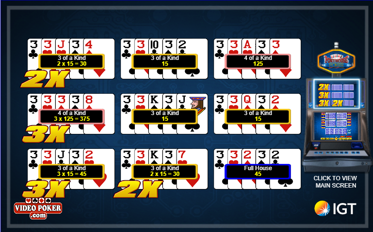 В следующих таблицах показаны дополнительные множители, выигранные в зависимости от раздачи при каждом количестве ставок. Например, если игрок играл в 9-5 Double Double Bonus в режиме 5-play и получил три одинаковые карты при раздаче, то таблица показывает, что он выиграет три множителя за каждую ставку на раздачу. Поскольку игрок сделал ставки на пять раздач, его общие дополнительные множители составляют 3×5 = 15.