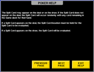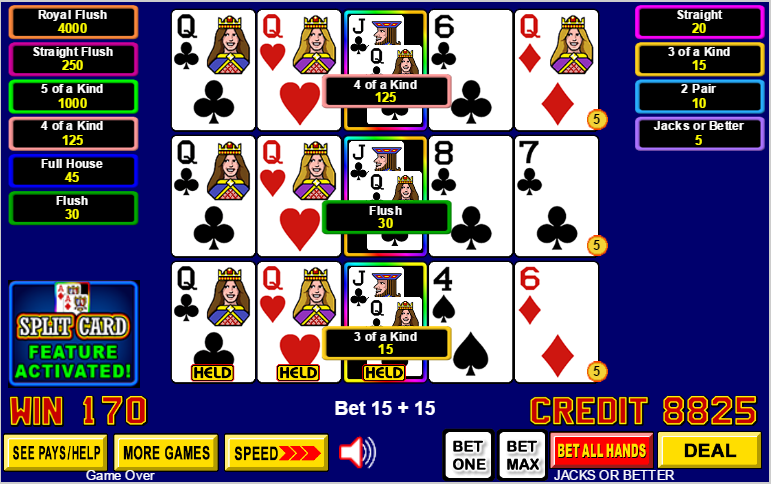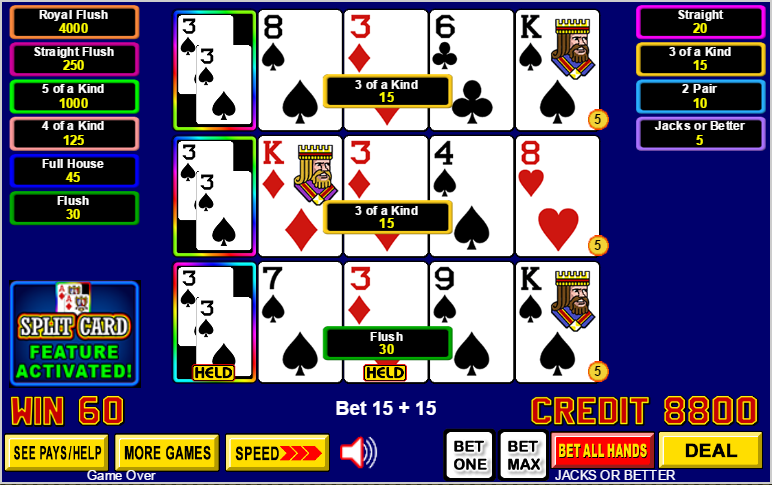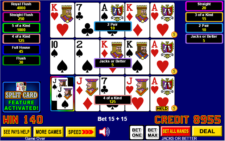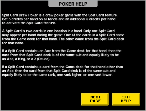 Split Card Poker — это разновидность видеопокера от IGT, в которой две карты могут занимать одну позицию. В этом случае гораздо проще составить высокооплачиваемые комбинации. Разделенные карты всегда одномастные и содержат либо карты одного ранга, либо карты последовательных рангов. Чтобы активировать функцию разделения карт, игрок должен удвоить свою ставку. Дополнительная ставка является платой и не увеличивает сумму выигрыша, за исключением того, что она добавляет пятерку одинаковых карт в таблицу выплат.