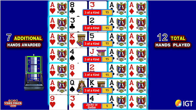 В следующей таблице показана вероятность всех возможных исходов 12 бонусных раздач после двух тузов, при условии, что игрок сбрасывает три одинаковые карты.