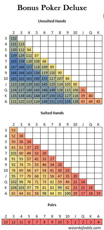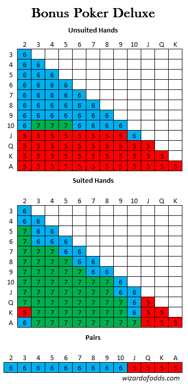 Следующая стратегия подойдет для игры Bonus Poker Deluxe со следующими таблицами выплат. Выигрыши выражаются в расчете на одну монету, исходя из ставки в пять монет за раздачу.