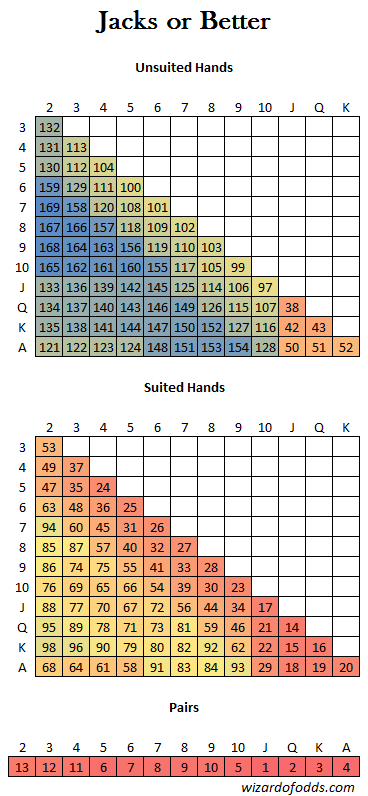 В следующей таблице показаны вероятности и доходность всех возможных исходов в игре Jacks or Better для указанной в таблице таблицы выплат. В нижней правой ячейке показана доходность в размере 96,49%.