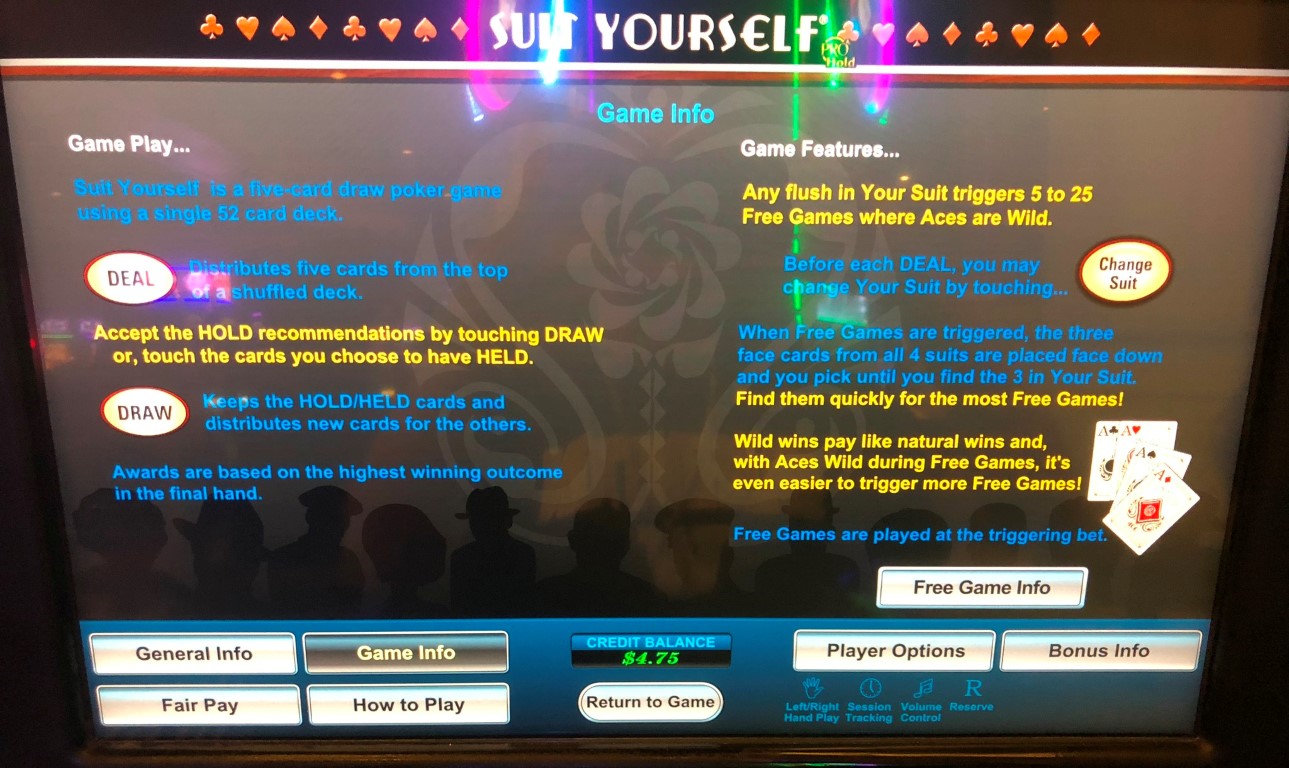 Suit Yourself — это видеопокер от U1. Суть игры заключается в том, что игрок выбирает масть, и если у него собирается флеш в этой масти, то он играет в бонусный раунд, где тузы являются джокерами, а таблица выплат не меняется. Эта функция в основном оплачивается с помощью узкой таблицы выплат, где наименее оплачиваемой комбинацией является пара тузов.