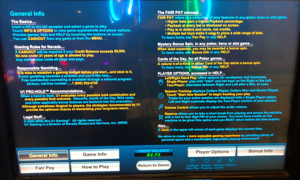 Приведенные выше данные о выплатах любезно предоставлены в справочных материалах. Они были получены с игрового автомата в казино Rampart в Лас-Вегасе. В компании U1 мне сообщили, что выплаты одинаковы для любого уровня ставки на всех их автоматах. Однако они добавляют, что казино может выбирать между настройками низкой и высокой волатильности, которые регулируются конфигурацией таблицы выплат. По их словам, большинство казино выбирают низкую волатильность.