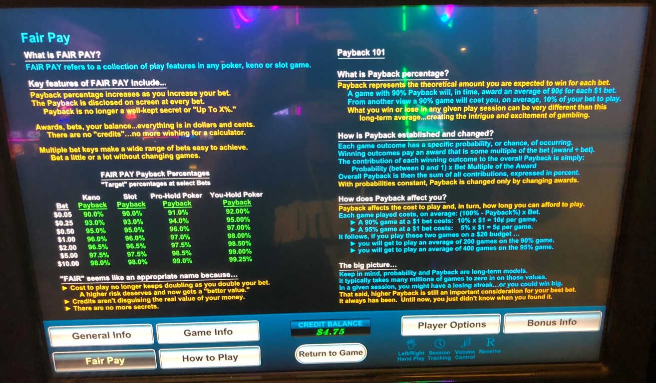 Возврат зависит от суммы ставки и от того, использует ли игрок функцию «вы удерживаете ставку» или «автоматическое удержание». При ставках в 10 долларов и меньше возврат увеличивается по мере увеличения ставки. Это достигается за счет микроизменений в таблице выплат. В следующей таблице показан возврат для обоих режимов в зависимости от сделанной ставки.