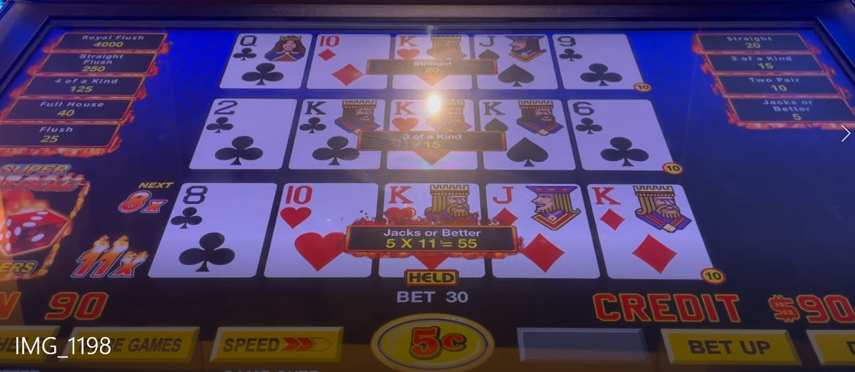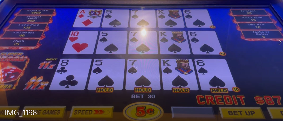 Моя пара тузов улучшилась до двух пар в верхней раздаче. В нижней раздаче я случайно выиграл множитель 11x. Базовая игра — 6-5 Bonus Poker, где выплаты составляют 1 к 1 за валеты или лучше и 2 к 1 за две пары. При ставке в 5 монет за игру мой общий «выигрыш» составил 5×(2 + 1 + 1×11) = 70 кредитов.