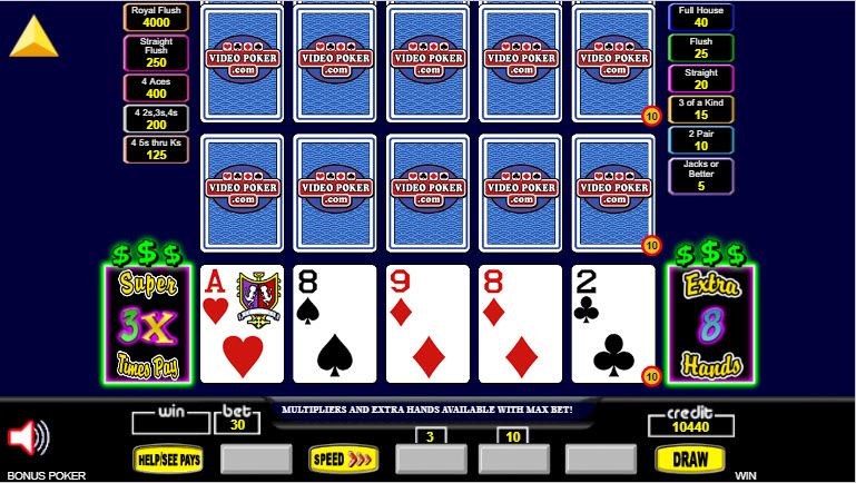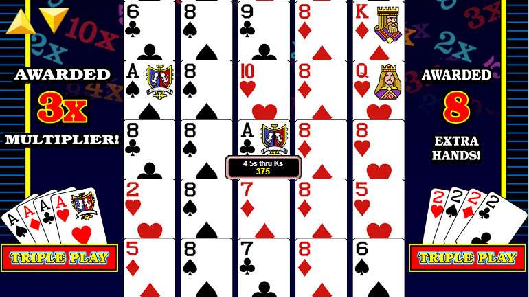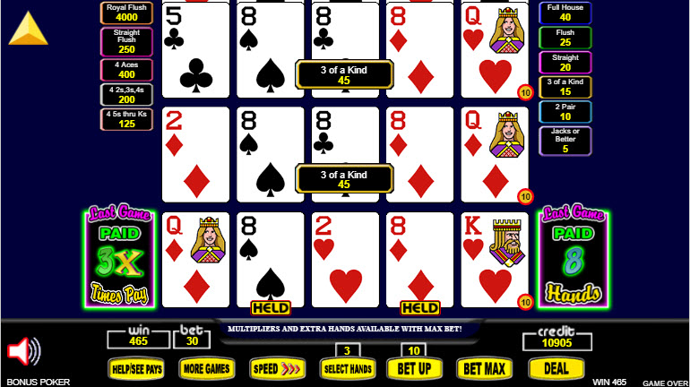 На изображении выше я играл в бонусный покер с тремя игроками. Эта функция была активирована, что дало мне множитель 3x и 8 дополнительных рук, в общей сложности 11 рук. Я решил оставить пару восьмерок.