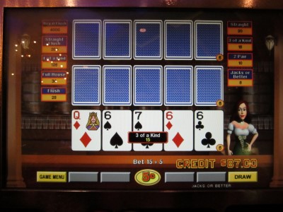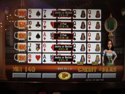 Были розданы заменяющие карты, и подсчитаны очки за раздачу. Общий выигрыш по бонусам составил 2×5 + 4×5 + 5×10 + 5×10 + 2×5 = 140.