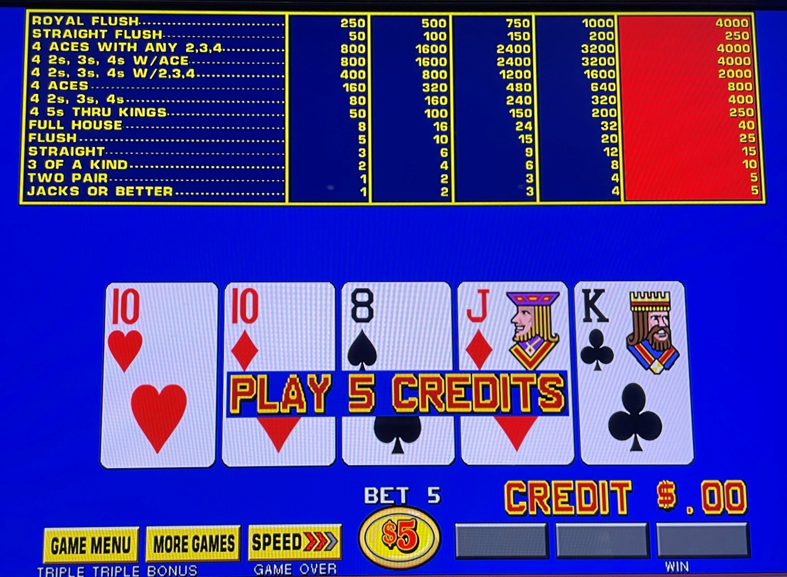 Triple Triple Bonus — это очень волатильная игра в видеопокер, в которой за четыре одинаковые карты выплачиваются высокие выигрыши, а за стрит или две пары — низкие.