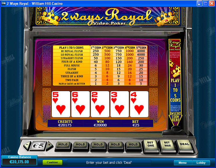 2 Ways Royal/Split Way Royal — это видеопокер, который можно найти в некоторых интернет-казино Playtech и Betsoft. Суть игры заключается в том, что стрит-флеш от 2 до 6 приносит такой же выигрыш, как и роял-флеш, — 800x, в зависимости от максимальной ставки.