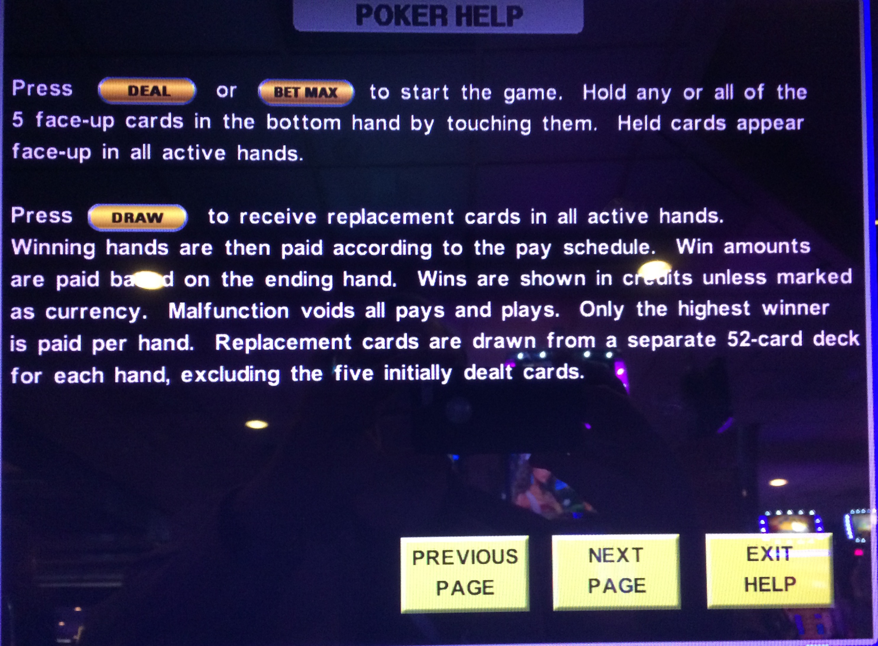 В столбце «Выплаты» указаны выигрыши за комбинации карт, которые различаются в зависимости от таблицы выплат. Во всех играх без джокеров, кроме Double Bonus, в столбце «Выплаты» указаны выигрыши за фулл-хаус и флеш. В Double Bonus также указан выигрыш за стрит. В игре Deuces Wild выплаты производятся за роял-флеш, пять одинаковых карт, стрит-флеш, четыре одинаковых карты, флеш и стрит. В Bonus Deuces Wild выплаты производятся за стрит-флеш, четыре одинаковых карты, флеш и стрит. Все остальные выигрыши в каждой игре являются стандартными, установленными IGT.