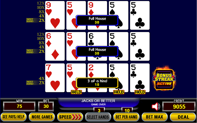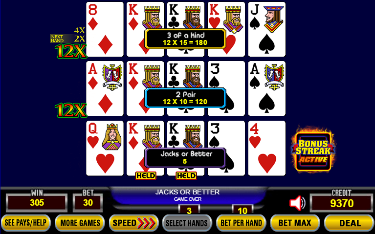В игре Jacks or Better фулл-хаус приносит бонусную серию из 2-4-8-10-12 в следующих пяти раздачах. Три одинаковые карты приносят бонусную серию из 2-4 в следующих двух раздачах.