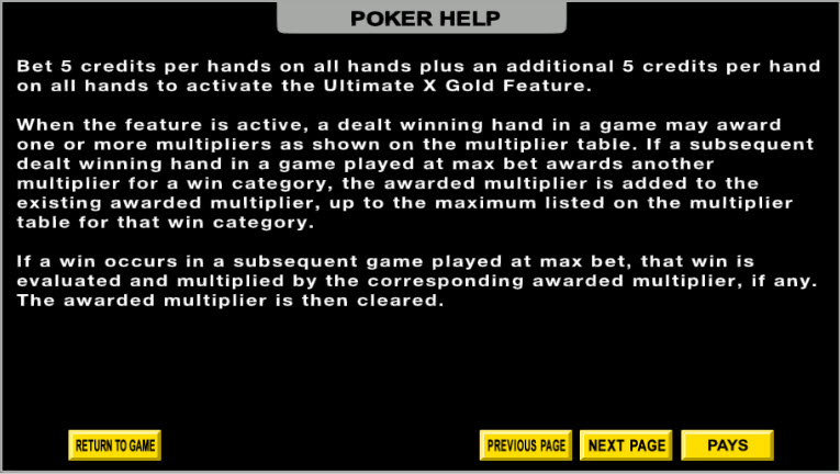 Ultimate X Gold — это вариант видеопокера от Action Gaming. Он основан на многопользовательском видеопокере, в частности, на игре втроём, впятером или вдесятером. Если игрок делает дополнительную ставку в пять монет за раздачу сверх обычной максимальной ставки в пять монет, активируется функция множителя. В отличие от обычного Ultimate X, множители применяются ко всем раздачам, но только к определённым выигрышам, и сохраняются до тех пор, пока не будут использованы.