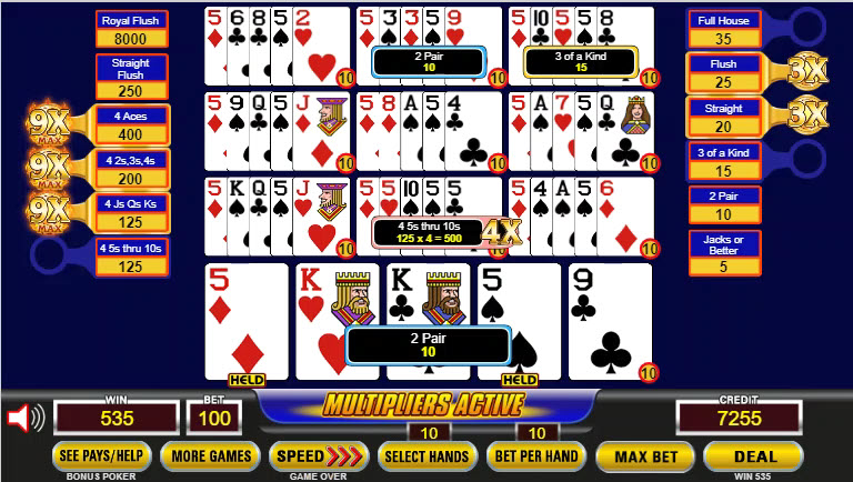 - Во всех играх, кроме Deuces Wild, комбинации от трёх до четырёх одинаковых карт будут иметь соответствующий множитель. В Deuces Wild множители будут соответствовать комбинациям от флеша до четырёх двоек.