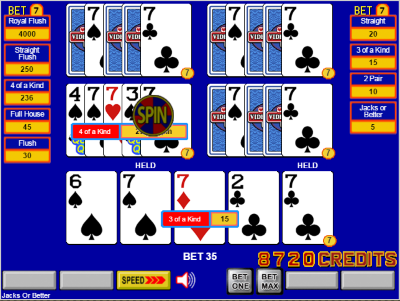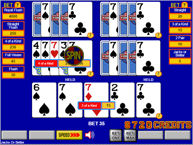 Правила Игра основана на видеопокере с тремя или пятью игроками. Ставки на каждую линию составляют от одного до пяти кредитов, и игра будет похожа на традиционный многопользовательский видеопокер. При ставке в шесть кредитов на линию активируется функция «Быстрые каре». Функция «Быстрые каре» означает, что если у игрока есть три одинаковые карты и две одиночные карты, и сумма двух одиночных карт равна рангу три одинаковых карт, то эти две одиночные карты можно сложить, чтобы образовать четвертую карту, равную по рангу три одинаковых карт, то есть четыре одинаковые карты. Эта функция применяется только к картам ранга от 2 до 10. Например, комбинация 3-6-9-9-9 будет считаться четырьмя одинаковыми картами. В игре, где ставка составляет семь кредитов на линию, активируются как функция «Быстрые четверки», так и функция «Колесо фортуны». В функции «Колесо фортуны» игрок выигрывает бонус за каждую четыре одинаковые карты, выпавшие на призовом колесе. Призы и коэффициенты распределения для призового колеса указаны ниже. Колесо призов Как и в большинстве игровых автоматов с призами, каждый сектор колеса имеет так называемый «вес». Сумма всех весов в данном случае составляет 323. Вероятность остановки колеса на каждом секторе пропорциональна весу этого сектора. Например, вероятность остановки на секторе с монетой 250 равна весу 38, деленному на общий вес 323: 38/323 = 11,76%.