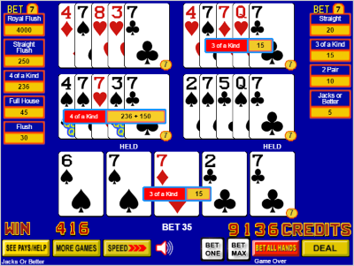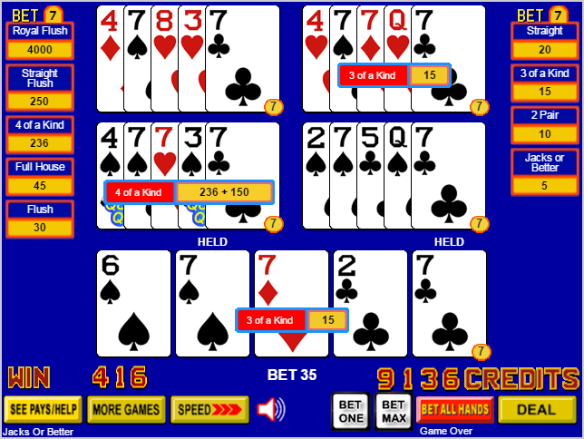 Остальные раздачи завершены, и все комбинации подсчитаны. Мой общий выигрыш составил 236 за четыре одинаковые карты (без учета бонусного вращения), по 15 за две тройки и 150 за бонусное вращение. Таким образом, общая сумма составила 236 + 2 × 15 + 150 = 416.