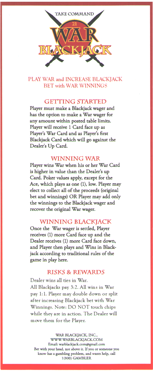 Впервые я увидел War Blackjack в отеле Downtown Grand в Лас-Вегасе 9 мая 2014 года. Мне сказали, что к тому времени игра уже была в отелях Carson City Nugget и Eureka в Меските. Игра представляет собой комбинацию War Blackjack и Blackjack. Главная фишка в том, что если игрок выигрывает ставку War Blackjack, он может использовать выигрыш для своей ставки Blackjack, уже зная свою первую карту и открытую карту дилера.