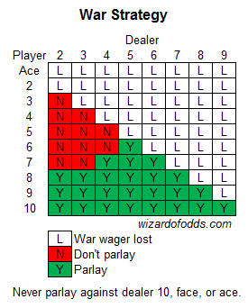 В следующей таблице показано ожидаемое значение ставки в блэкджеке, основанное на начальной карте игрока и открытой карте дилера, только в ситуациях выигрышной ставки «Война». Таблица основана на бесконечных колодах, где дилер берет карту при мягкой 17, допускается удвоение ставки после разделения и допускается сдача. «Проигрыш» в таблице означает, что игрок проиграл ставку и, следовательно, ему не нужно принимать решение по экспресс-ставке. Игрок должен сделать экспресс-ставку на выигрышную ставку «Война» в любой ситуации с положительным ожидаемым значением.