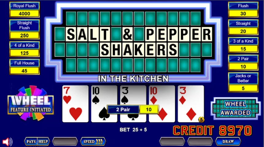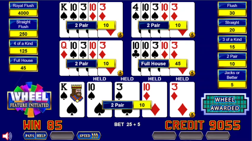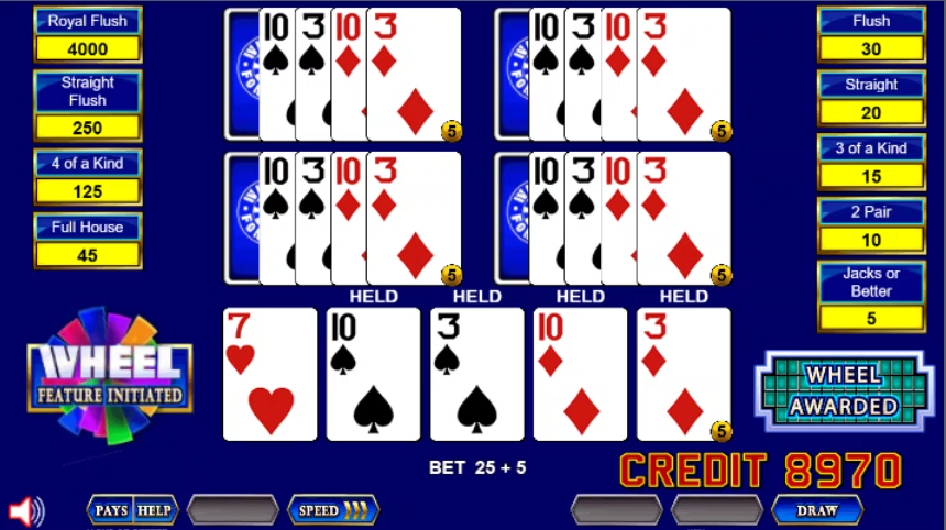 Wheel of Fortune Poker — это разновидность видеопокера, основанная на многопользовательских автоматах. В обычной игре ставка составляет от одного до пяти кредитов за ход. За дополнительную ставку в пять кредитов (не за ход, а всего пять) игрок получает шанс выиграть вращение колеса.