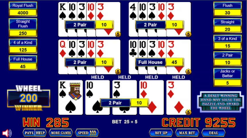В итоге я выигрываю 10 кредитов за каждую из 4 пар из двух чисел, 45 за фулл-хаус и 200 за вращение колеса, что в сумме составляет (4*10) + 45 + 200 = 285.