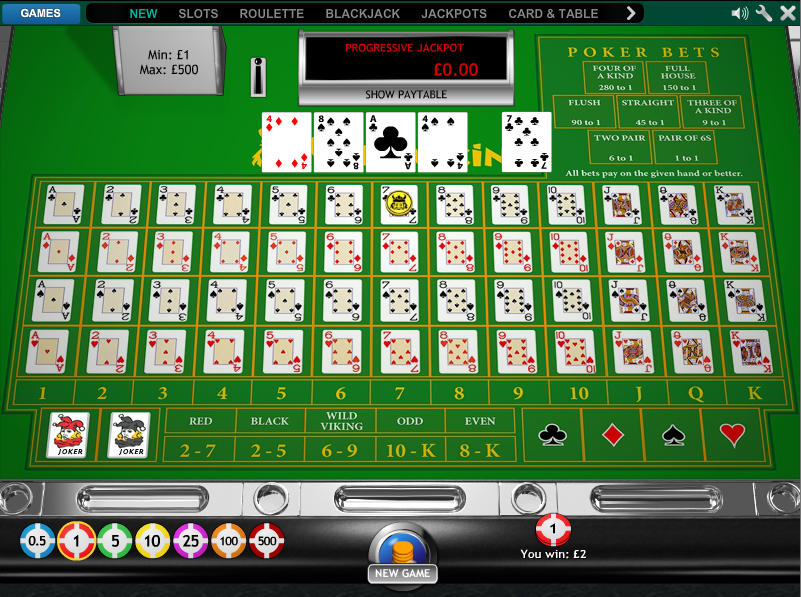 Наконец, есть прогрессивный джекпот, называемый «Дикий Викинг». Он также выплачивается в зависимости от ценности финальной пятикарточной комбинации. Чтобы выиграть джекпот, игрок должен получить «Дикого Викинга», который определяется как дикий роял-флеш, где первая и последняя сданные карты являются джокерами. Таблица выплат выглядит следующим образом.