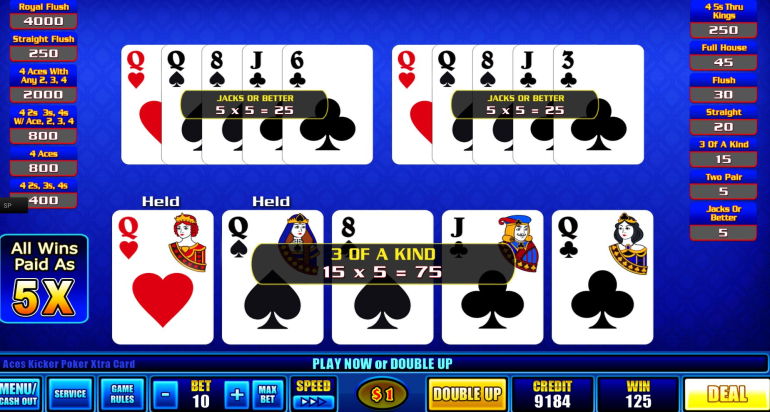 - Если игрок делает ставки от 1 до 5 кредитов за игру, то игра будет проходить как обычный видеопокер.