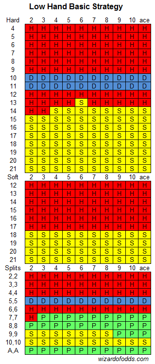 Заранее приношу извинения за такое описание стратегии разделения. Моё единственное оправдание — в большинстве случаев решение будет довольно очевидным. В остальных случаях используйте таблицы ниже, чтобы определить ожидаемую стоимость каждой комбинации стартовой руки игрока и открытой карты дилера. Для каждого возможного варианта игры сложите ожидаемые значения младшей и старшей рук и выберите вариант с наибольшей суммой.