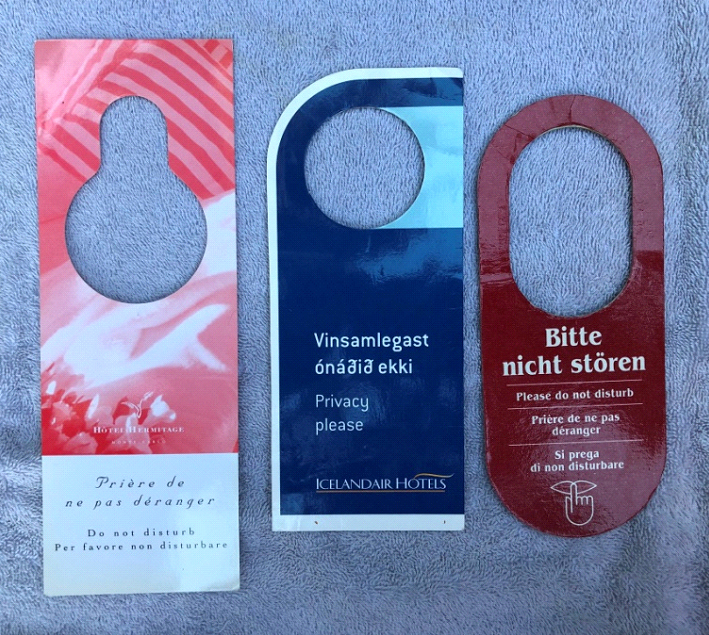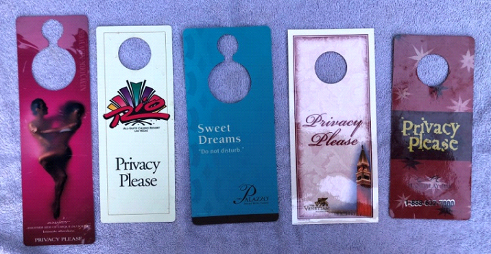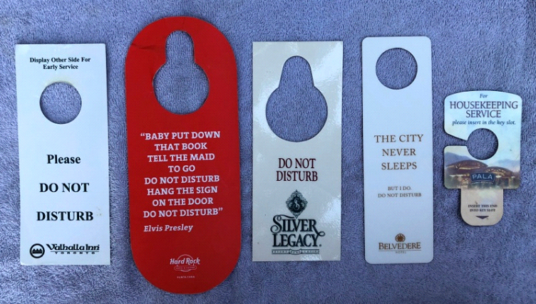 Одна из многих вещей, которые я коллекционирую, — это таблички «Не беспокоить» из отелей. Одно из требований для включения таблички в коллекцию — на ней должно быть указано название конкретного отеля. Другими словами, это не должна быть общая табличка, которую можно использовать на любой двери отеля, или табличка, указывающая на крупный бренд, но без указания конкретного отеля. Ещё одно требование — я должен был останавливаться в этом отеле.