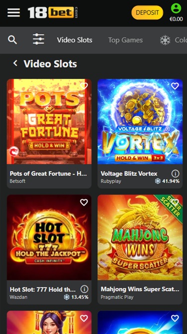 Большинство игр, доступных в казино 18bet, — это слоты. Казино предлагает сотни видеослотов и множество классических слотов. Также есть несколько прогрессивных джекпотов, которые можно выиграть, получив миллионные призы для своих клиентов.
