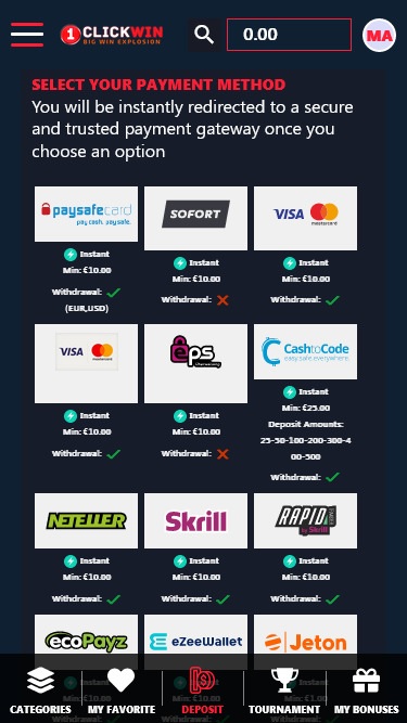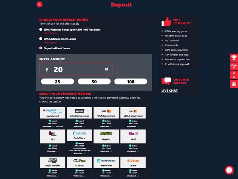 Что касается способов оплаты, казино 1ClickWin предлагает игрокам возможность пополнения счета через множество различных платежных систем, таких как Visa, MasterCard, Trustly, Paysafecard, Neteller, Skrill и другие. Помимо стандартных способов пополнения, есть также возможность внесения средств в криптовалюте для тех, кто предпочитает такой способ оплаты.