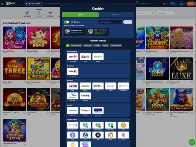 Казино 20Bet — хорошее место для азартных игр, практически мгновенные ставки. Выбор игр огромен, мне также нравится современный дизайн их сайта. Я вполне доволен своим опытом работы с 20Bet.