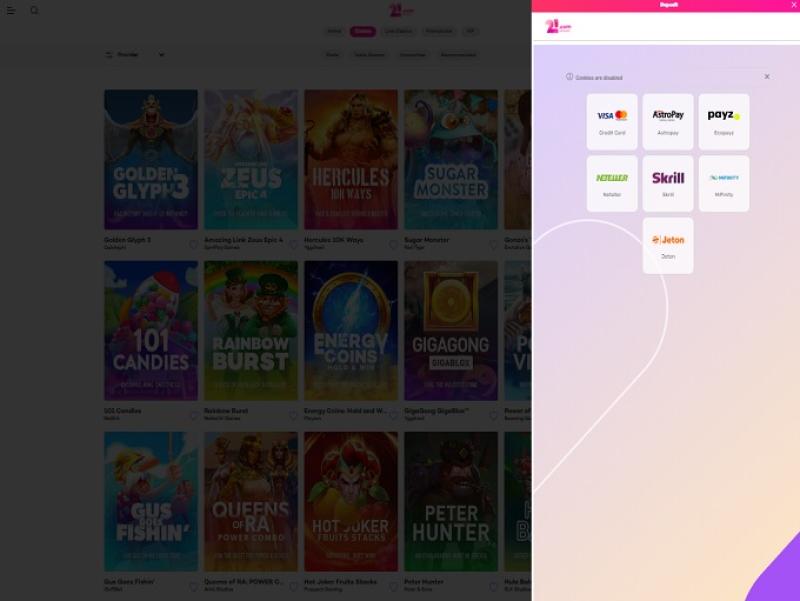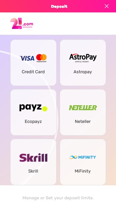 21.com работает на платформе Microgaming, Net Entertainment, BetSoft, 1x2gaming, Barcrest, Big Time Gaming, ELK Studios, Evolution Gaming, Genesis Gaming, iSoftBet, lightningboxgames, Novomatic, Oryx, Play'n GO, playson, Quickspin, Rabcat, Relax Gaming, Thunderkick, Yggdrasil, Endorphina, Wazdan, Booming Games, Pragmatic Play, Nolimit City, Felt Gaming, Red Tiger Gaming, Fantasma Games, FunFair, Kalamba, Triple Edge Studios, Northern Lights Gaming, Stormcraft Studios, Switch Studios, OneTouch, Electric Elephant Games, Pocket Games Soft, Bulletproof Games, All41 Studios, Gluck Games, Gameburger Studios, Pulse 8 Studios, Neon Valley Studios, Golden Rock Studios, Spearhead Studios, Swintt, Shuffle Master, SpinPlay Games, GONG Gaming, Blue Guru Games, Lady Luck Games, Buck Stakes Entertainment, Games Global, 2by2 Gaming, Bally Technologies, bluberi, Blueprint Gaming, GamesOS, Greentube, NextGen, Push Gaming, WMS, SG Interactive, Gamomat, Red7Mobile, Side City Studios, Bally Wulff, Iron Dog Studio, Foxium, Just For The Win, Reflex Gaming, Storm Gaming Technology, PearFiction Studios, Wild Streak Gaming, Slingshot Studios, Golden Hero, Fortune Factory Studios, Jade Rabbit Gaming, STHLM Gaming, RubyPlay, 4ThePlayer, AvatarUX, Gamevy, Crazy Tooth Studio, ReelPlay, Japan Technicals Games, Alchemy Gaming, Black Pudding Games, Snowborn Games, Boomerang Studios, Hacksaw Gaming, Max Win Gaming, Gold Coin Studios, Bang Bang Games, Half Pixel Studios, SilverBack Gaming, Peter And Sons, Eurostar Studios, Aurum Signature Studios, Armadillo Studios, FlipLuck, Area Vegas, Leap Gaming, Atomic Slot Lab and Indigo Magic , а само казино имеет интегрированную веб-платформу, которая загружается через ваш любимый интернет-браузер. Это избавляет от необходимости скачивать громоздкое программное обеспечение и делает процесс игры на сайте простым и удобным. Конечно, полностью поддерживается игра на мобильных устройствах, что позволяет делать ставки с помощью смартфона или планшета.