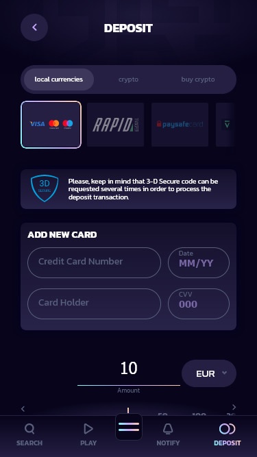 Что касается способов оплаты, вы сможетевносить депозиты в различных криптовалютах . Помимо криптовалютных депозитов, вы также можете выбрать такие популярные варианты, как Neteller, Visa, Mastercard, Jeton, MuchBetter и Mifinity.