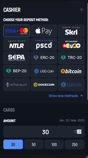 Казино принимает как фиатные валюты, так и криптовалюты.