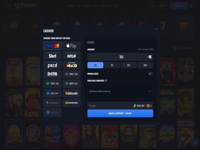 Что касается способов оплаты, в Aerobet вы можете использовать несколько банковских вариантов для управления своими средствами, включая Visa , Mastercard, Skrill , MiFinity, Apple Pay , Paysafecard и MB Way. Компания также принимает несколько криптовалют, таких как Bitcoin, Dogecoin , Ethereum , Litecoin , USD Coin и Tether .
