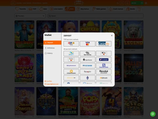 Плюс 75 бесплатных вращений в игре Big Bass Splash (Pragmatic Play). Минимальный депозит: 20 евро. Для активации бонуса за депозит с бесплатными вращениями необходимо внести депозит не менее 60 евро. Максимальная ставка: 5 евро. Максимальная сумма вывода: 10-кратная сумма бонуса.