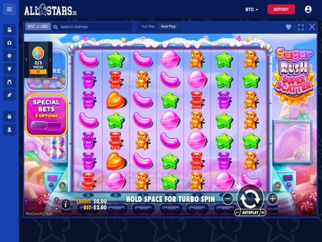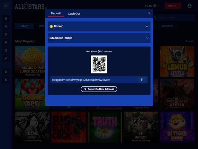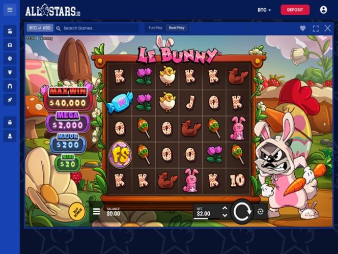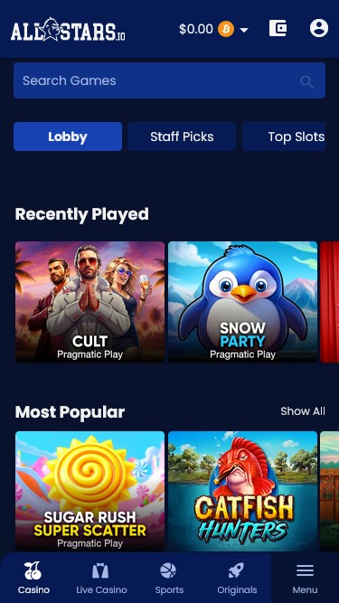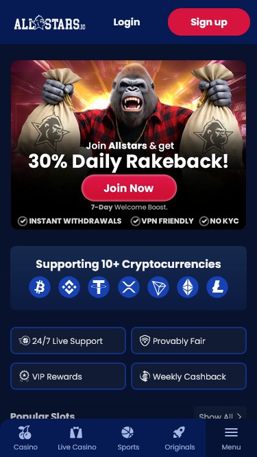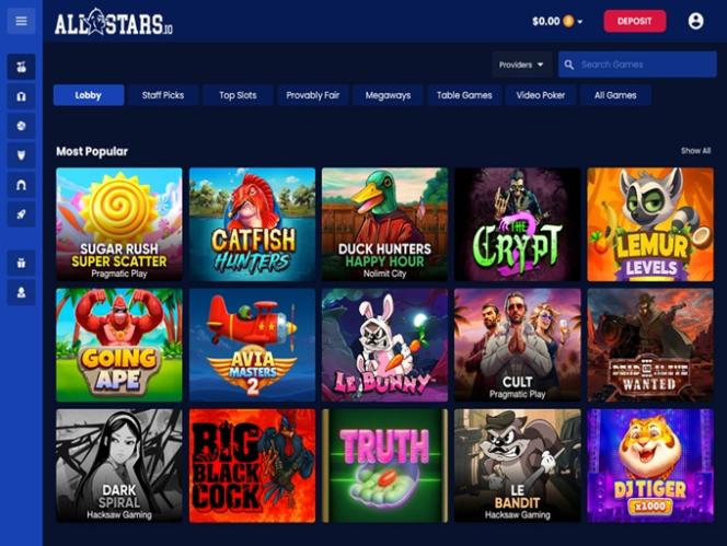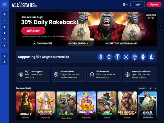 Казино AllStars производит сильное первое впечатление благодаря смелому, энергичному стилю, созданному для игроков, ценящих разнообразие. На главной странице представлено множество слотов, игр с элементами Crash, столов с живыми дилерами, рынков ставок на спорт и текущих акций, так что здесь всегда что-то происходит. Казино обладает современной атмосферой крипто-казино, но при этом достаточно простое в навигации, чтобы не заблудиться.