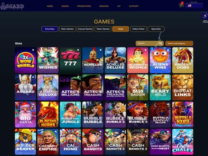 Ознакомьтесь с некоторыми играми, адаптированными для США, доступными в Asgard Slots: Asgard, Asgard Deluxe, Aztec's Millions, Aztec's Treasure, Aztec's Treasure Feature Guarantee, Bass Baggin, Beary Wild, Big Cat Links, Big Santa, Blazing Horse, Bonus Wheel Jungle, Bubble Bubble, Bubble Bubble 2, Bubble Bubble 3, Buffalo Mania Deluxe, Buffalo Mania Thunder Springs, Builder Beaver, Caesar's Empire, Cai Hong, Cash Bandits, Cash Bandits 2, Cash Bandits 3, Cash Bandits Museum Heist, Cash Chalet, Cash Chaser, Charms of the Forest, Cleopatra's Gold, Clue Chronicles: Mirror Mansion, Copy Cat Fortune, Cosmic Crusade, Count Cashtacular, Count Spectacular, Coyote Cash, Crystal Waters, Cubee, Derby Dollars, Desert Raider, Devil's Джекпот, Бриллиантовая дюжина, Бриллиантовая фиеста, Египетское золото, Зачарованный сад, Эпическая праздничная вечеринка, Побег с Севера, Вечная любовь, Фантастическая миссия, Огненный дракон, Удача фьорда, Футбольное безумие!, Счастливый Будда, Счастливый Зевс, Удачи Олимпа, Удачи лягушек, Фруктовое безумие, Фруктовые сбережения, Фу Чи, Фуцзанлун, Драгоценные фрукты, Удар драгоценных камней, Ключи из драгоценных камней: Тайная магия разблокирована, Гемтопия, Корабль-призрак, Гигантские удачи и многое другое.