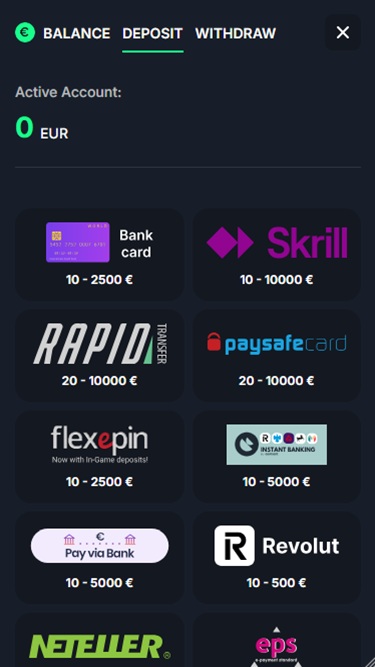 Казино принимает криптовалюты и евро в качестве единственных фиатных валют.