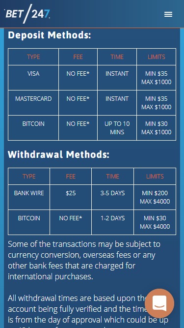 Банковская система Bet247 неплохая, хотя, безусловно, не лучшая из тех, что мы видели. Сайт принимает депозиты через Visa, Mastercard и Bitcoin, а вывод средств — через Bitcoin и банковский перевод. Время обработки выигрышей составляет 48 часов, а обработка Bitcoin может занять на день-два больше. Обработка банковских переводов может занять на 3-5 рабочих дней больше. Максимальная сумма вывода составляет 4000 долларов в неделю.