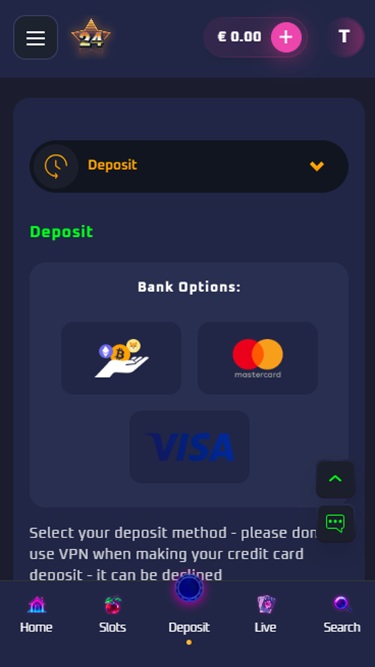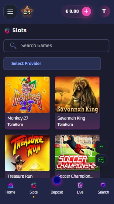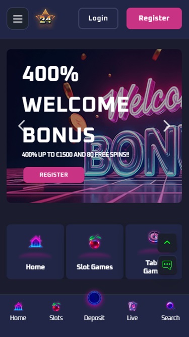 Платформа казино использует темный фон и является адаптивной и оптимизированной для всех устройств, как настольных, так и мобильных. Bet24Star хорошо организована; она выглядит компактной и довольно простой в навигации.