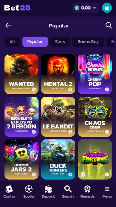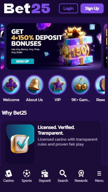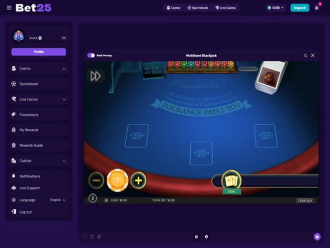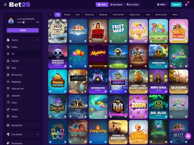 Что касается традиционных бонусов и акций, Bet25, к сожалению, предлагает меньше, чем можно было бы ожидать. Хотя программа лояльности гарантирует, что как игроки казино, так и любители ставок на спорт будут получать регулярные скидки и кэшбэк, мы бы, безусловно, хотели увидеть более частые бонусы в будущем.