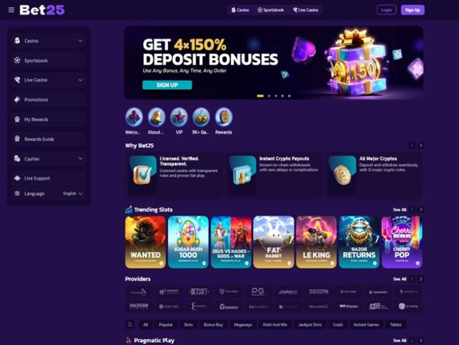 Основанное в 2025 году, Bet25 — крупное онлайн-казино, принимающее игроков из Германии, Австрии, Финляндии, Канады и Новой Зеландии и приглашающее их ознакомиться с обширным выбором игр казино и вариантов ставок на спорт. Бренд предлагает тысячи онлайн-слотов, игры с живыми дилерами, настольные игры и мгновенные игры, а также несколько акций и бонусов для своих игроков.