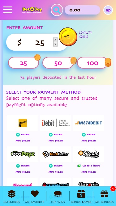 Казино Bet4Joy начисляет 1 бонусный балл за каждые 10 долларов, поставленных на кон, а 100 баллов можно обменять на 1 доллар наличными в казино.